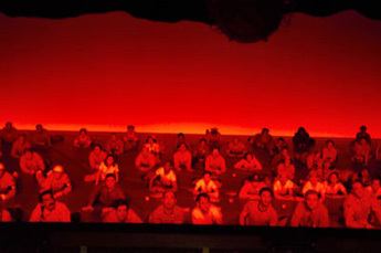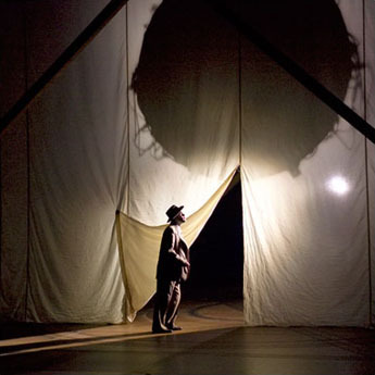 presently gets lifted out of sight up into the theater’s rafters (as the real thing was lifted atop its testing tower on the occasion of the actual test), and now, as the countdown enters its final minutes (minutes that seem to stretch and buckle under the pressure of Adams’s throbbing score), the entire cast and chorus, gathered on the raked stage (one minute and counting, 30 seconds, 20 seconds, 10), fall to their knees and then onto their bellies, sprawled out prone facing toward the audience, their heads tucked under their arms, ducking, waiting, waiting, the music throbbing, throbbing to its basso-crescendo (not an explosion, exactly; in fact, not an explosion at all; rather, simply the hugeness of what is happening becoming more and more palpably real), at which point, as their bodies start being bathed in this unholy light, they lift their heads in awe. We do not see what they are seeing;