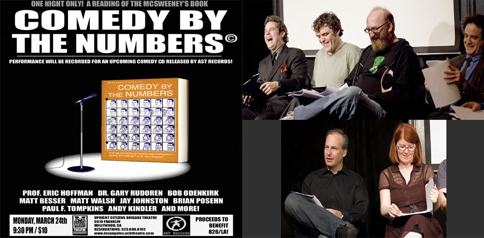 Thanks to A SPECIAL THING records and the generosity of talent, time, & spirit of numerous hilarious comedians we were able to record an all-star CD of some of the funniest numbers from COMEDY BY THE NUMBERS – thanks to Bob Odenkirk, David Cross, Paul F. Tompkins, Andy Kindler, Janeane Garofalo, Matt Walsh, Matt Besser, Jay Johnston, Tim Heidecker, Brian Posehn, Kate Flannery, Patton Oswalt, and many more. Big Thanks to the Upright Citizens Brigade/LA where we recorded most of the tracks in a live event, which also raised a bunch of money for 826!