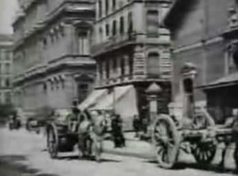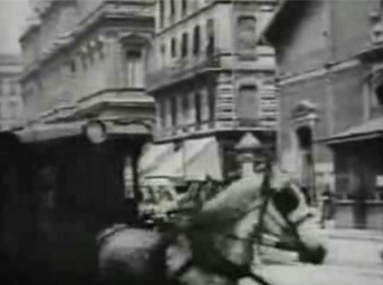 All this is in grey, and the sky above is also grey—you anticipate nothing new in this all too familiar scene, for you have seen pictures of Paris streets more than once. But suddenly a strange flicker passes through the screen and the picture stirs to life. Carriages coming from somewhere in the perspective of the picture are moving straight at you, into the darkness in which you sit; somewhere from afar people appear and loom larger as they come closer to you; in the foreground children are playing with a dog, bicyclists tear along, and pedestrians cross the street picking their way among the carriages. All this moves, teems with life and, upon approaching the edge of the screen, vanishes somewhere beyond it.
