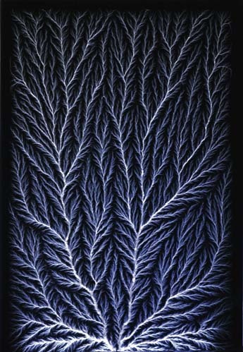 Essentially, the hyper-slow-motion cinematic capture of a lightning bolt in the process of erupting into being. However, the more appropriate metaphor might be: in the process of searching and probing and dallying and circling back and losing itself and finding itself elsewhere only to peter out anew and then branching off again, probing further, until it finally makes contact with ground, with Ground Zero as it were, at which point it rebounds into brilliant sudden being (all in a fraction of a fraction of a second) …
