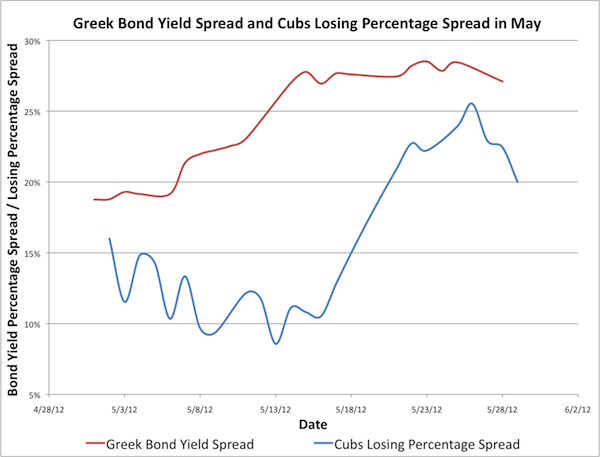 And what of the Cubs? Well, just as Greek bond yields have increased relative to the strong German bund, so too has the Cubs loss percentage increased relative to the NL Central division leading Cincinnati Reds. The Cubs losing percentage spread now stands at 20% and bears an uncanny resemblance to the trajectory of Greece’s bond yield spread. The chart above clearly shows the two indicators rising in tandem at a frightening velocity. The truth is, because both the Cubs and Greece are getting worse at such an aggressive rate, it will soon no longer make sense for either of them to honor their current affiliations.