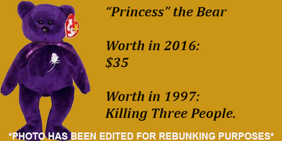 Rebunking Claim: Henri Paul was in the pay of a malevolent organization, but it wasn’t a government organization. It was the one group that stood to gain the most from Diana’s death: Ty Beanie Babies. By late 1997, the Beanie Baby fad was all but at an end and seemed to be disappearing the way of other fads such as the pet rock, the digital pet, and the digital rock. Yet, in October of 1997, Princess the Bear, a Beanie Baby dedicated to Diana, was announced and sales of the bear brought Ty back to the forefront of collectible fabric animal-shaped bags of beans. Anyone that says it’s absurd that a toy company would arrange to have the Princess of Wales killed to boost their sales and keep them relevant needs to open their eyes and get ready for what happens when hoverboard sales start tanking.
